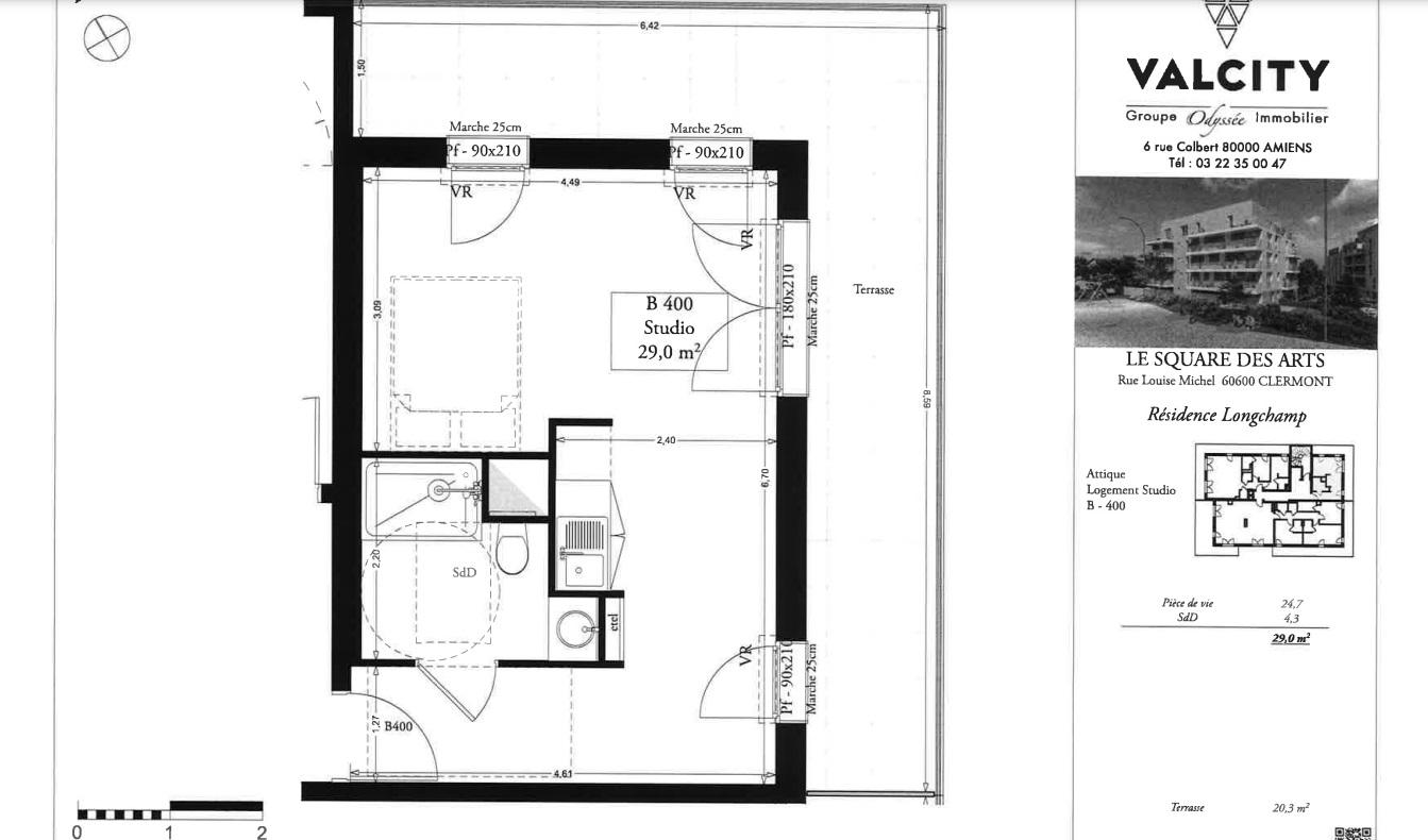 Beau et grand studio de 29m², en bon état, au 4ème étage avec terrasse de 20.30m², comprenant: entrée, salle d'eau avec WC, kitchenette équipée et aménagée, et pièce à vivre de 24.70m².