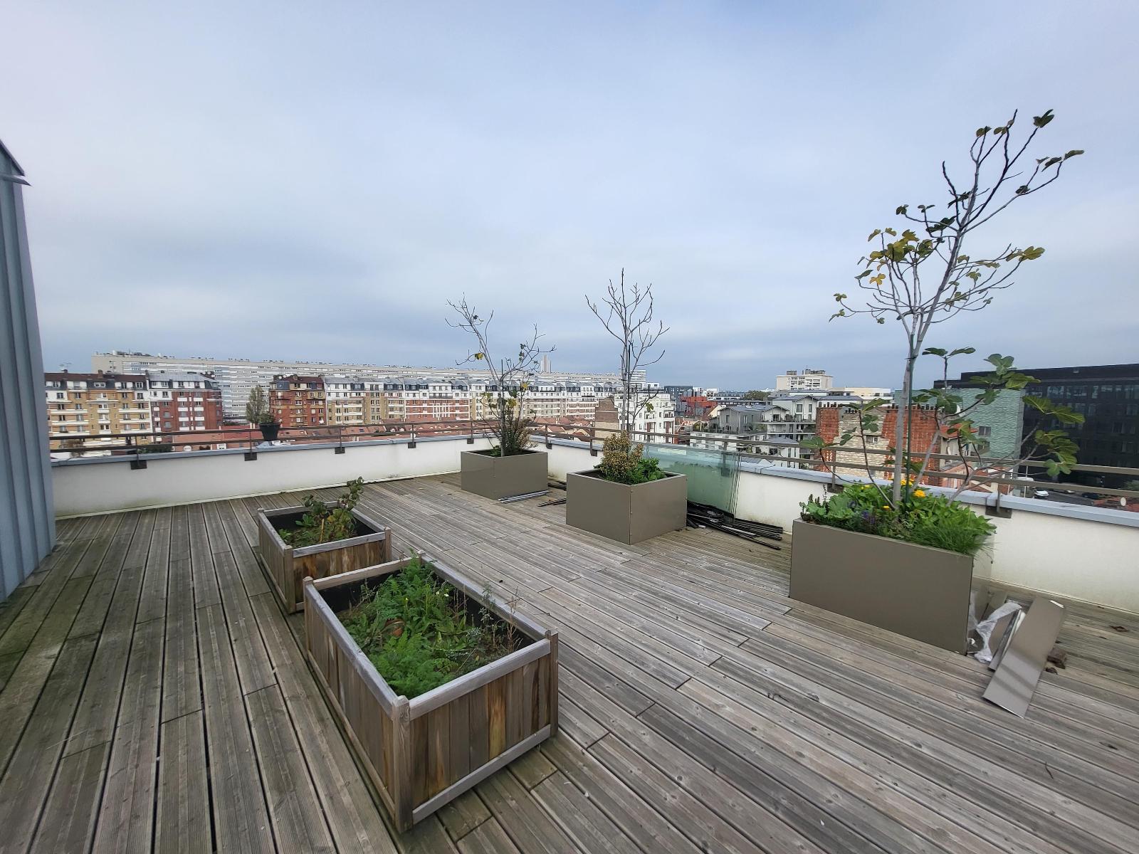 La résidence dispose également d'un toit terrasse avec une vue panoramique sur Paris, aménagé en jardin collectif accessible par ascenseur.