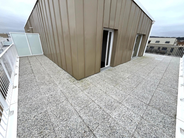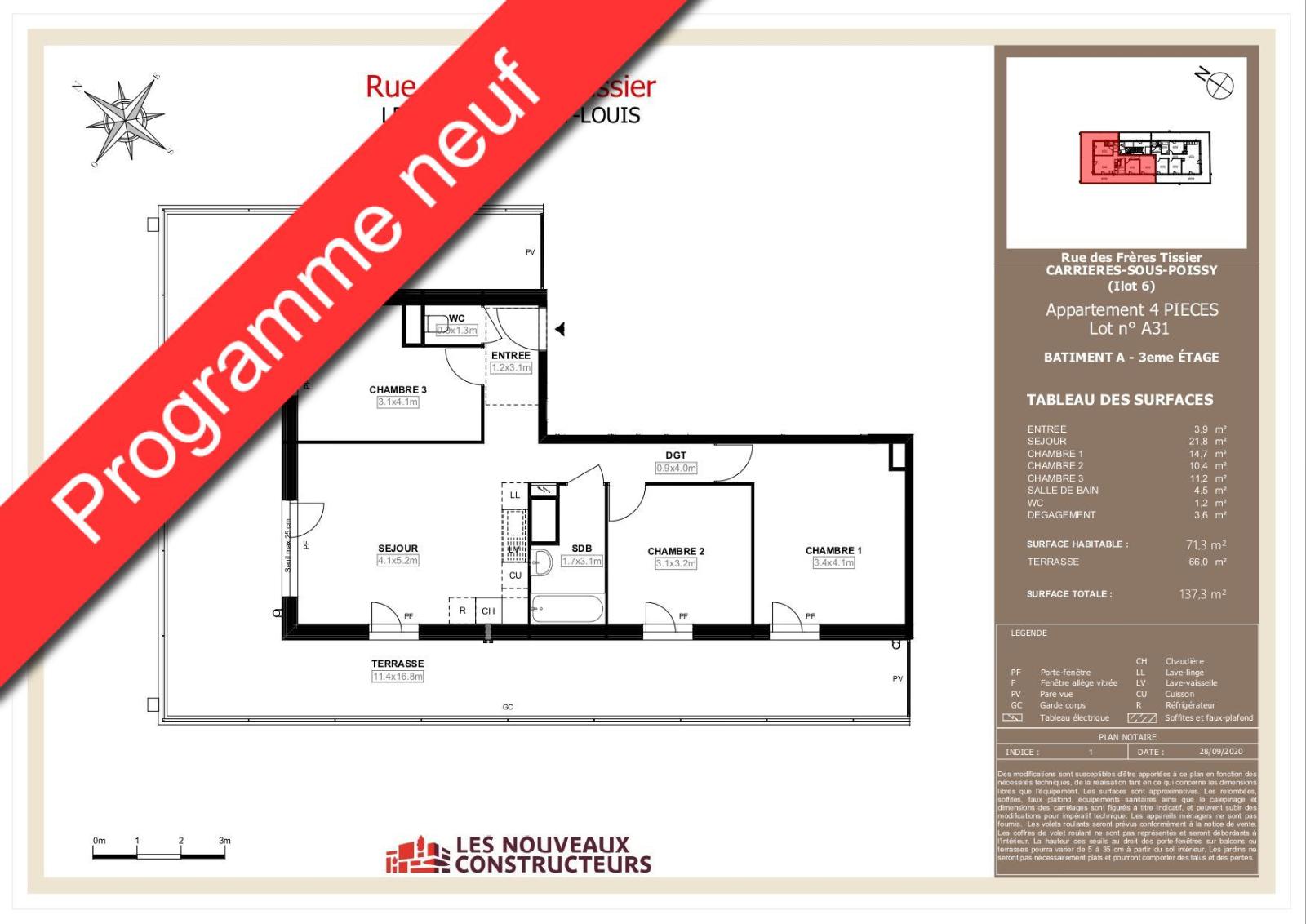 Beau F4 neuf d'une superficie de 71.30m², au 3ème et dernier étage avec terrasse de 66m², comprenant: entrée, WC indépendant, chambre, séjour de 21.80m² avec cuisine ouverte, dégagement, salle de bains, et deux chambres.