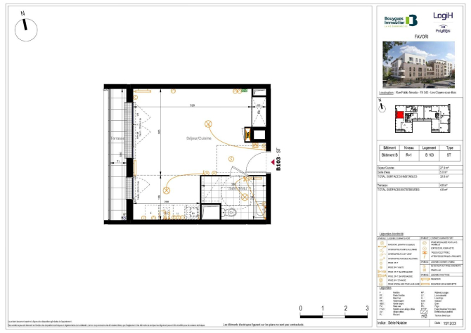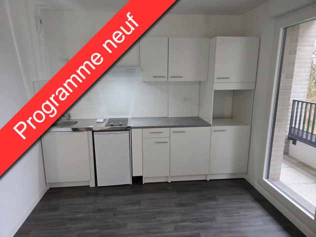 Beau et grand F1 neuf de 32.80m², au 1er étage avec terrasse de 4.80m², comprenant: entrée, salle d'eau avec WC, pièce à vivre de 27.90m² avec placard et kitchenette équipée.