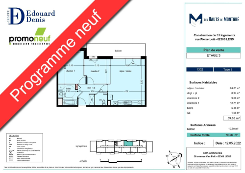 LENS - Location appartement neuf. Résidence neuve "Les Hauts de Montgré", avec accès sécurisés, et proche toutes commodités. Beau F3 neuf de 59.88m², au 3ème étage avec balcon de 10.70m² orienté au Sud-Est, comprenant: entrée avec placard, salle de bains, deux chambres, WC indépendant, séjour de 24.01m² avec cuisine ouverte équipée et aménagée. Parking extérieur sécurisé. Libre le 1er Avril 2026. Loyer de 800,00 euros par mois charges comprises dont 100,00 euros par mois de provision pour charges (soumis à la régularisation annuelle). Les honoraires charge locataire sont de 785,63 euros ( soit 13,12 euros/m² ) dont 181,44 euros pour état des lieux ( soit 3,03 euros/m² ). Montant estimé des dépenses annuelles d'énergie pour un usage standard : entre 289 et 391 euros. Prix moyens des énergies indexés en 2021.